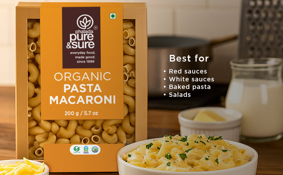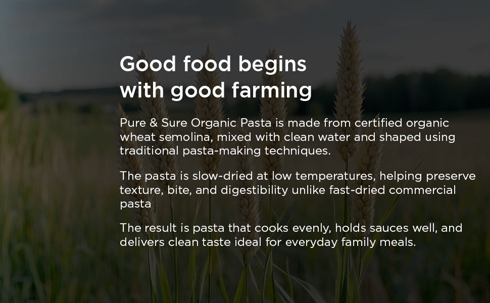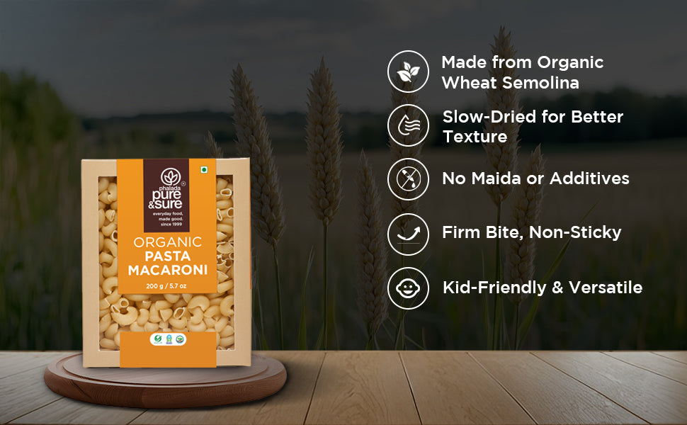 Pure & Sure Organic Macaroni is made from 100% organic whole wheat and shaped into smooth, sturdy elbows that cook perfectly every time. Naturally fat-free, cholesterol-free, and full of wholesome grain nutrition, it makes your mac-n-cheese, soups, and bakes cleaner, lighter, and more satisfying.